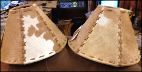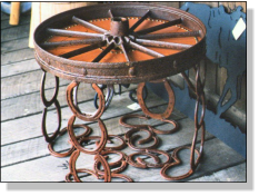I also make many items for your home – antique wagon wheel chandeliers and potracks – from small wheel barrow size to larger wagon wheel sizes with or without a rawhide shade – these light fixtures hang from a beautiful handmade chain and are wired. Coffee tables made from an antique wagon wheel (can be used with glass to show your special trophy belt buckles) leather covered table under the wagon wheel, with horse shoe legs. Email for pricesGenuine Buffalo Skulls, some hand painted with fox tails and feathers. Email for prices
